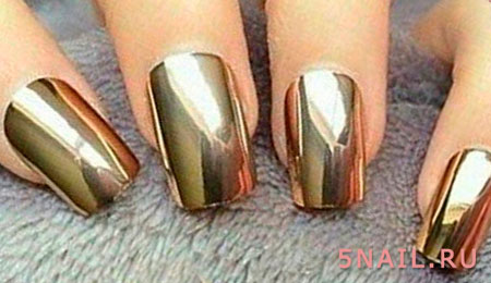 Некоторые девушки прибегают к другой технике нейл дизайна, придают коготкам сияющий эффект при помощи специальной цветной фольги, готовых полосок. Маникюр с зеркальным эффектом при помощи полосок делается следующим образом: