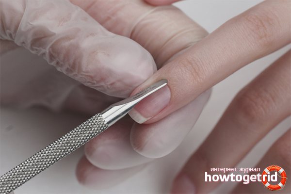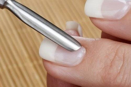 Если ногти покрыты гелем или лаком базу необходимо предварительно снять. В ином случае она не позволит работать пушером под определённым углом. Продезинфицируйте шабер и кожу специальным антисептиком для рук. Можно также воспользоваться водкой, медицинским спиртом, хлоргексидином либо перекисью. Состригите свободный край ногтя, выравнивая длину