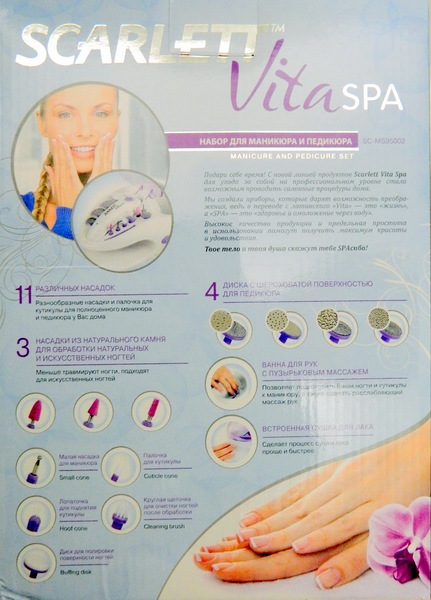 Насадки перечислены, а вот отметок для чего именно каждая из них предназначена нет. Имеются и некоторые противоречия по ходу инструкции по использованию ванночки. В каких-то моментах рекомендуется использовать ее до механической обработки, в каких-то после.