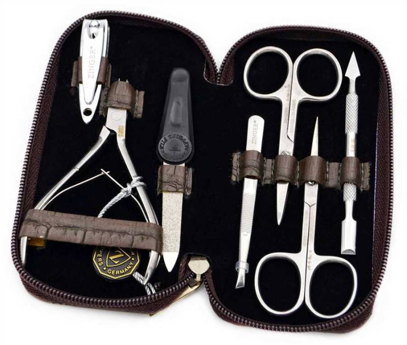 Если говорить о классических стандартных наборах, то чаще всего в них входят 5–7 предметов. Это ножницы, маникюрные кусачки Zinger, книпсер, шабер, пилочка, триммер, пинцет.