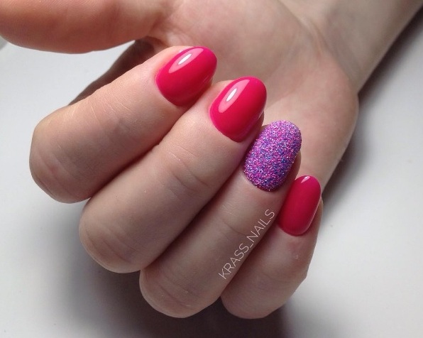 Покрытие одного пальчика. В этом случае меланж (или мармелад) наносится на не все пальчики, а только в качестве яркого акцента для одного или двух пальчиков. В этом случае нужно подбирать родственные оттенки, чтобы добиться контраста фактуры.