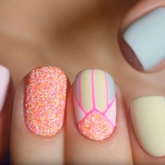 Вот такой красивый маникюр можно выполнить с использованием меланжа для дизайна ногтей. На это у вас уйдет минимум времени и усилий, а результат обязательно превзойдет все ожидания. Очень рекомендуем вам научиться делать красивый матовый геометрический маникюр с использованием «мармелада». Подробный урок по выполнению данного нейл-арта вы найдете в заключительном видео.