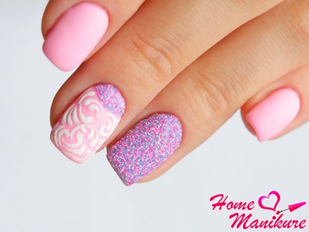 Несмотря на то что французский маникюр является классическим, в последнее время многие стилисты предпочитают в нем заменять футуристические «улыбки» на полукруглые формы, посыпанный «сладким» песком. Этот нейл-арт хорошо подходит для романтического образа и очень популярен при оформлении маникюра невестам. - Кондитерский декор.