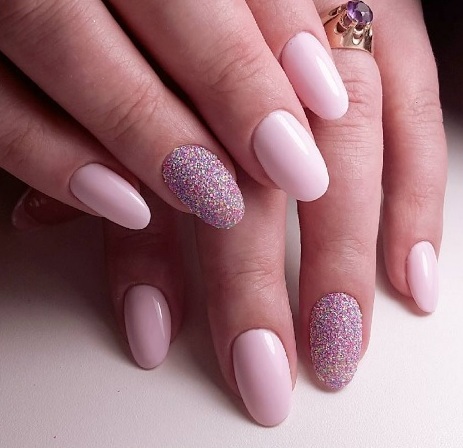 3. Выбранный для дизайна ноготок покройте и с помощью насыпьте небольшое количество мармелада на всю поверхность ногтя. Высушите в лампе и уберите излишки кисточкой.