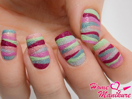 После полного высыхания данный материал создает шершавую «мармеладную» поверхность разного цвета. Подобный вариант дизайна достойно украсит как летний, так и зимний маникюр.