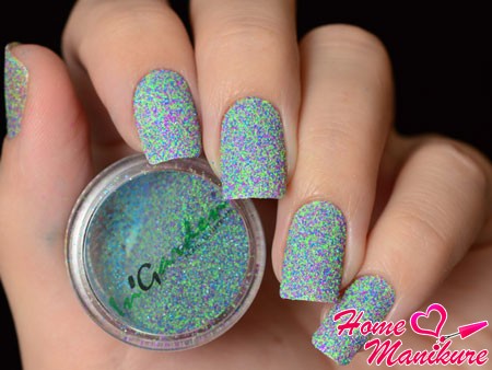 – не совсем обычный продукт. На первый взгляд, он ничем не отличается от обычного лака с блестками. Но вот тут и содержится подвох. Помимо блесток, лак содержит абразивные частички, которые создают на ногтях . Если баночку с лаком не встряхнуть перед использованием, можно получить совсем неожиданный результат: цвет и поверхность покрытия будут существенно отличаться от первоначального вида средства.