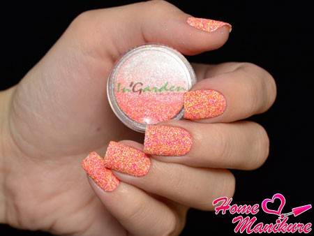 В виде материала «мармелад» представляет собой разноцветную пудру или песок. От акриловой пудры он отличается большим размером песчинок. И из-за более крупной текстуры на ощупь «мармелад» слегка шершавый. Популярность такого маникюра растет каждый день, и палитра расцветок на сегодняшний день составляет уже более 35 цветов.