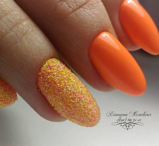Чтобы красиво оформить ноготки с таким эффектом, необходимо вначале сделать градиент, потом украсить акриловой пудрой. Такой дизайн будет смотреться просто, стильно и со вкусом. Кроме этого, в декоре можно использовать самые различные сочетания ярких цветов. - Мармеладная лунка.