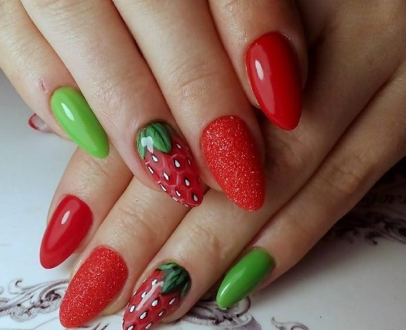 Самый обычный лак может стать основой для творчества в умелых руках. При желании дизайн можно дополнять блестками, стразами, сочетать с другими стилями, играть на контрастах или использовать плавные переходы в маникюре омбре. Делайте так, как подсказывает вам ваша фантазия. Изображение можно нанести только на один ноготок или нарисовать ягодки на всех сразу. Если у вас недостаточно развит художественный талант или вы не хотите погружаться в процесс рисования, то воспользуйтесь наклейками. Самый разнообразный слайдер-дизайн для ногтей сейчас легко найти в специализированных магазинах. С наклейками процедура выполнения нейл-арта будет не только простой, но и очень быстрой.