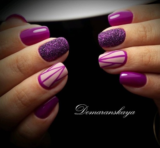 В геометрическом nail art. При нанесении геометрических форм и линий. Одну из фигур выделите липкой лентой по контуру, нанесите на фигуру бесцветную базу и посыпьте меланжем. Можно каждую фигуру в композиции выделять разноцветным меланжем.