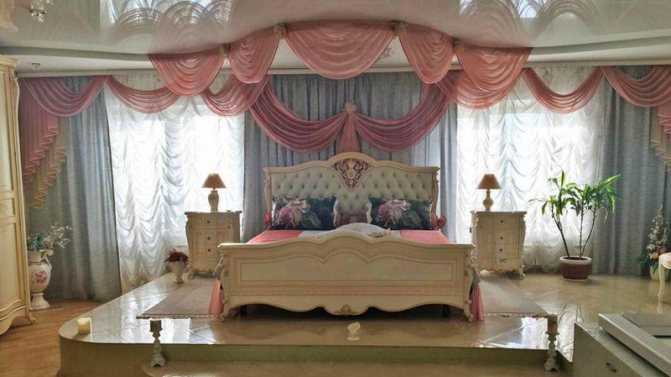 В спальне Маши пол отделан дубовым паркетом, как и в гостиной. Стены оклеены светло-бежевыми обоями с классическим ненавязчивым орнаментом. Огромная кровать с полукруглым изголовьем застелена розовым покрывалом с цветочным принтом, идеально подходящим по цвету и стилю к шторам. Напротив кровати установили два столика: на одном расположили телевизор, над вторым, туалетным, повесили зеркало в резной раме.