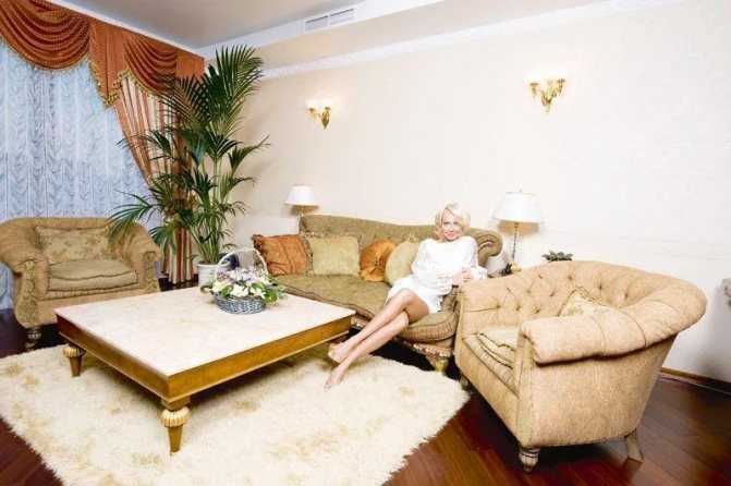 Центральное место в квартире Малиновской занимает гостиная, оформленная в классическом стиле. Изысканно и роскошно здесь смотрится глянцевый дубовый паркет и мебель в тон полу: