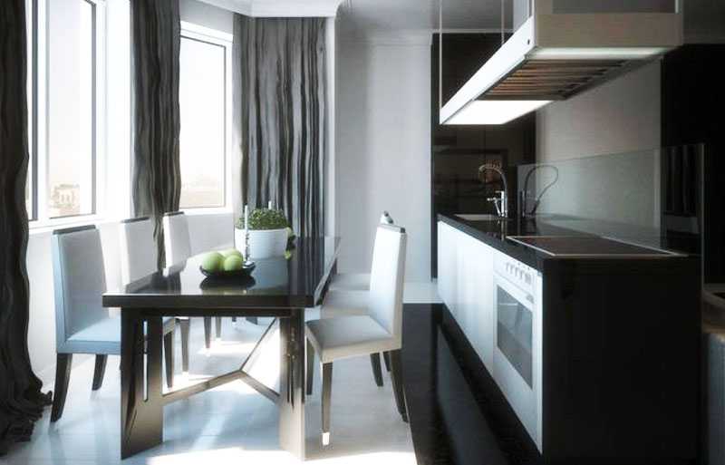 На пол в рабочей зоне уложили чёрный глянцевый кафель, который идеально подходит к общей обстановке. Окна украсили однотонными шторами из натурального шёлка стального оттенка. Дополняют оформление столовой зоны вазочка с фруктами и кашпо с цветами.
