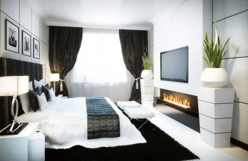 Напротив кровати установили современный биокамин и закрыли его тонированным стеклом. На стене повесили огромную плазму, по обе стороны от неё поставили эффектные подставки, на которых разместили белоснежные кашпо с живыми цветами.