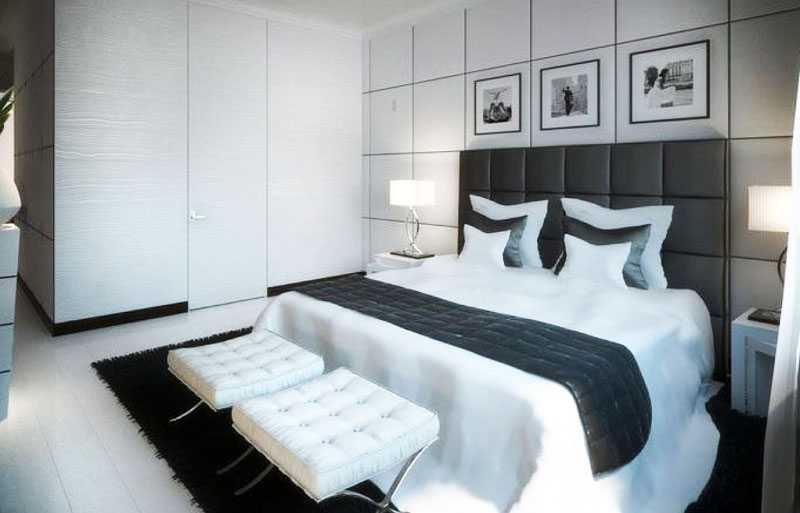 В оформлении спальни применялись ахроматические цвета: серый, белый и чёрный. Для отделки стен использовали эффектные панели и декоративную штукатурку, на пол уложили светлый паркет. Главное место в комнате занимает роскошная кровать с высоким мягким изголовьем, обитым шениллом. Сверху постелили белоснежное меховое покрывало и уложили несколько рядов декоративных подушек.