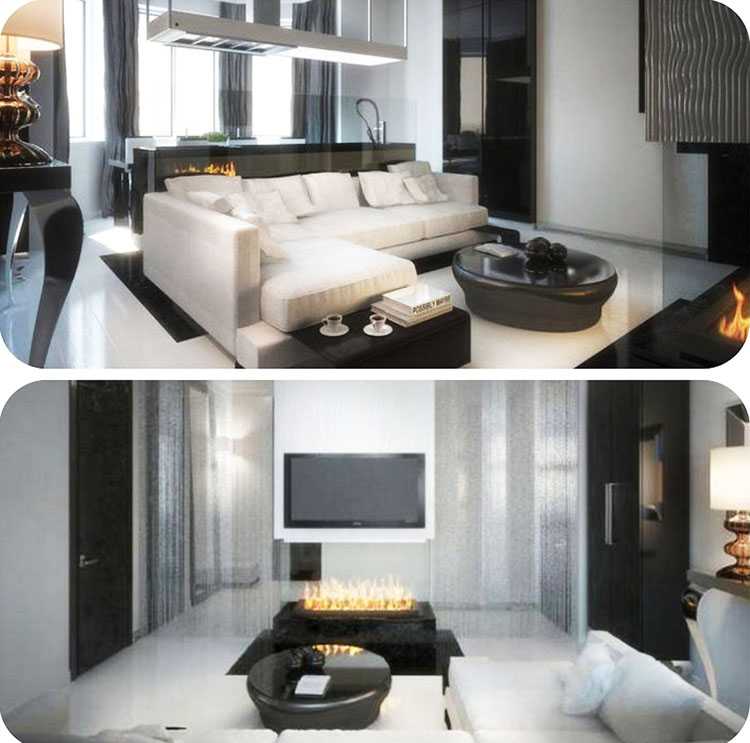 Гостиную от прихожей отделяет нежная белоснежная вуаль, придающая интерьеру нотку воздушности и женственности. Напротив зоны отдыха установили инновационный биокамин, блики которого в вечернее время создают особую душевную атмосферу в гостиной.