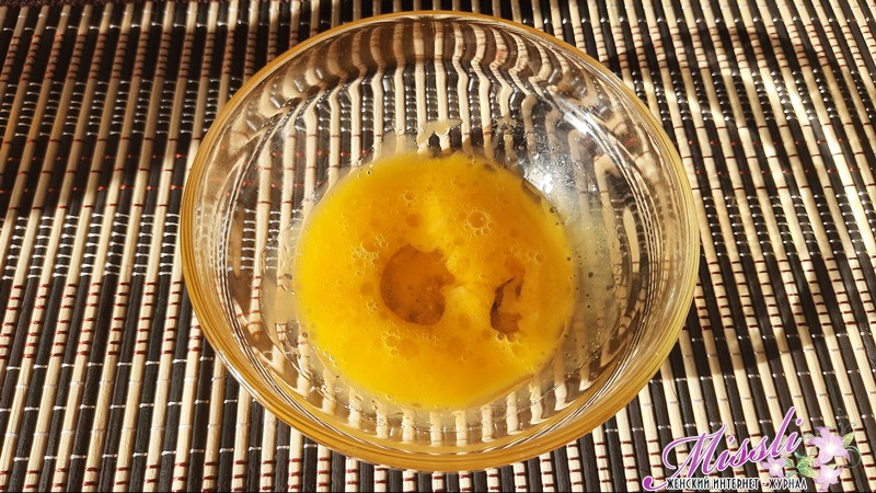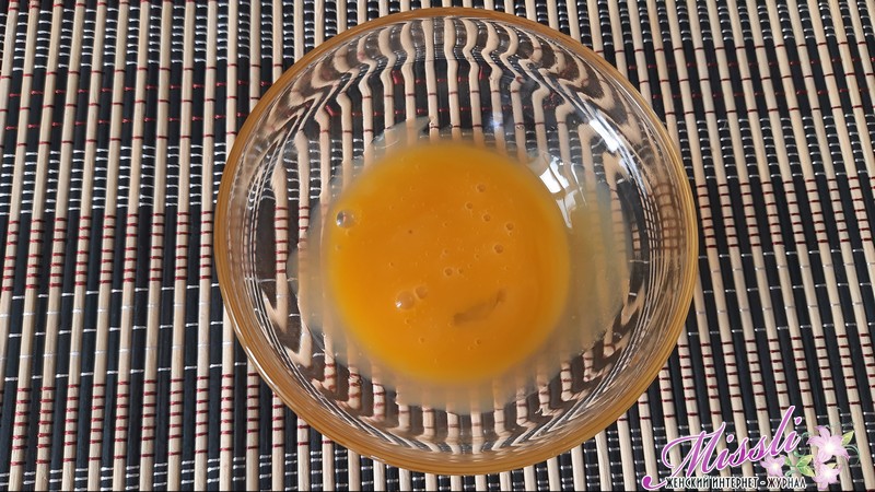 Один куриный желток переливают в небольшую емкость и хорошо взбивают при помощи вилки.