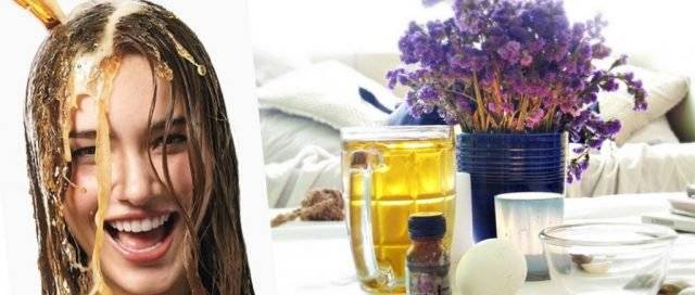 - Смешайте 100 мл слабоалкогольного напитка с 1 ст. л. растопленного меда и 1 желтком. Немного подогрейте гущу и вотрите ее в кожу головы. По истечении 25-30 минут промойте шевелюру с шампунем.