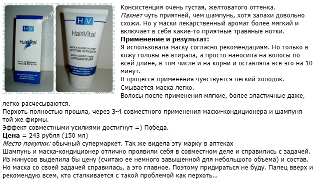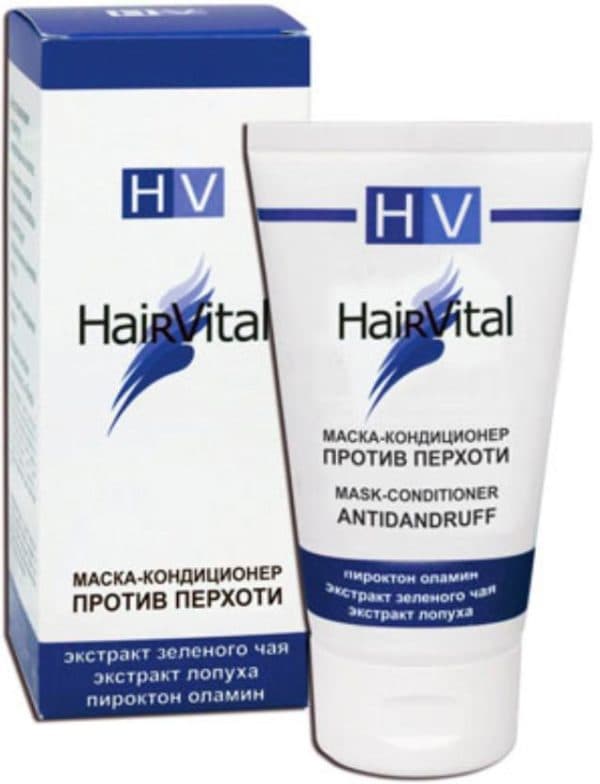 - Маска-кондиционер против перхоти «Hair Vital» (Италия). Это средство оказывает воздействие в нескольких различных направлениях: позволяет предотвратить грибок, который провоцирует появление перхоти, регулирует работу сальных желез, снимает сильное шелушение и зуд, увлажняет кожу, а также укрепляет корни и луковицы. Лучше всего маску использовать вместе с прочими средствами из той же серии. Применять средство следует единожды или дважды в неделю на протяжении трёх-пяти недель. Цена составляет около 300 рублей за упаковку объёмом 150 миллилитров.