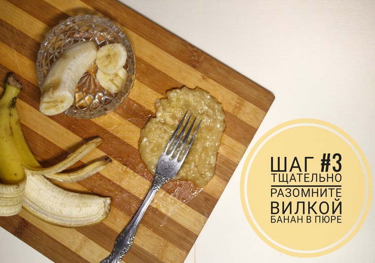 Шаг #3 Выложите банан на плоскую поверхность и тщательно разомните вилкой, пока банан не превратится в подобие кашицы, старайтесь растолочь все кусочки и не оставить сгустков.