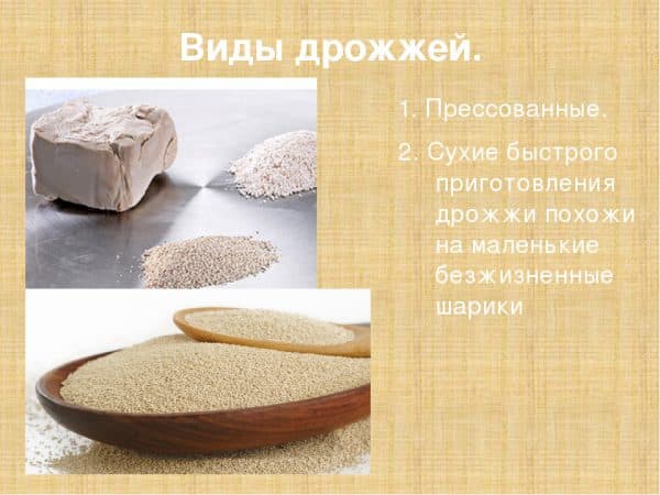 Сухие дрожжи представлены в виде гранул разного диаметра. Преимущество такой разновидности в том, что продукт имеет длительных срок хранения, достигающий 1-2 года. Гранулы необходимо залить тёплой водой, после чего дать смеси настояться в течение 20-30 минут. Сухие дрожжи быстро растворяются в любой жидкости, за счёт чего существенно сокращается время на приготовление маски.