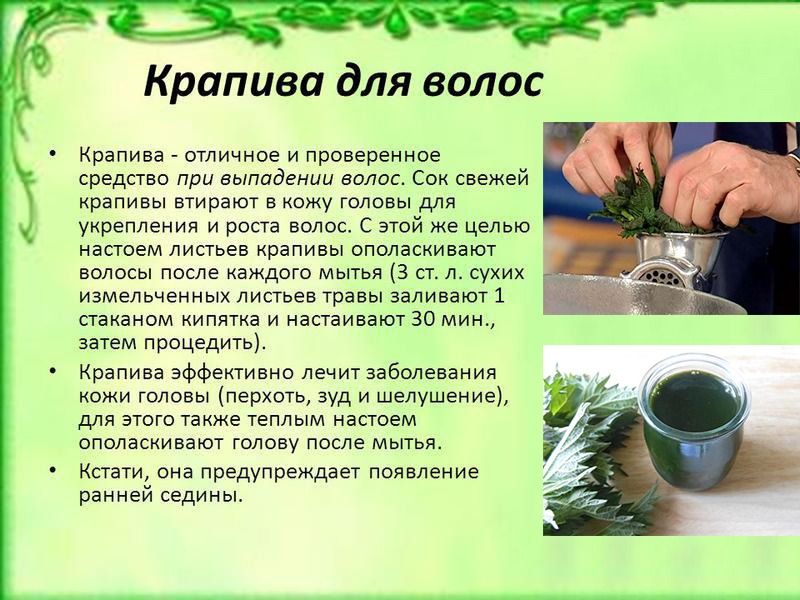 Содержит большое количество витаминов и минералов. В ее составе присутствует группа В, витамин К, С, А, Е. Использовать отвар следует три раза в неделю. Желательно мыть им голову через день. В целом курс составляет 2 месяца. Эффект отмечается уже через неделю после использования. Волосы становятся более гладкими и послушными. Таким отваром за месяц длина отрастает на несколько сантиметров.