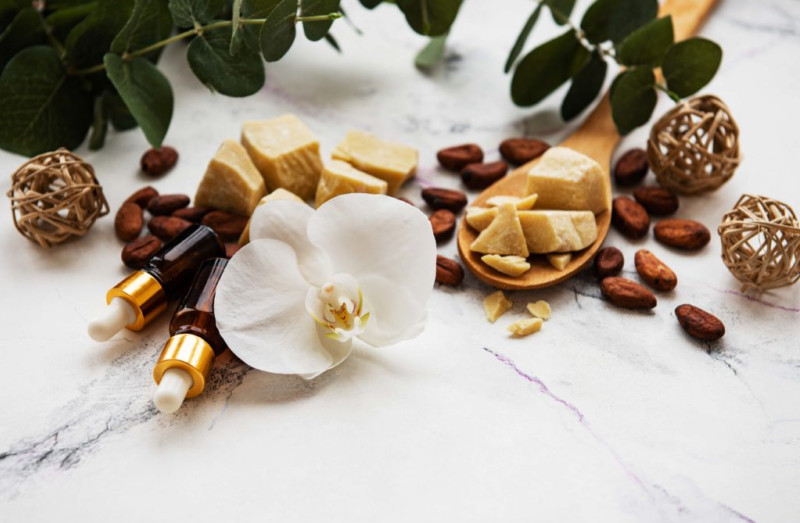 Масло репейника, миндаля или оливы (2 ст. л.) соедините с 1 ст. л. какао-порошка, немного нагрейте маслянистую смесь на водяной бане. Прибавьте 3 капельки эфира иланг-иланга, апельсина или лаванды, влейте по ампуле витаминов Е и А.