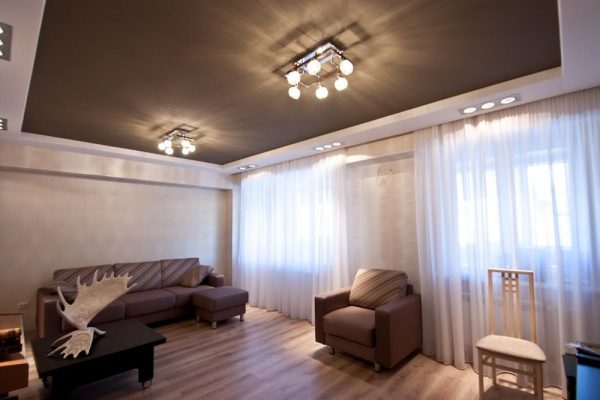 Светлый потолок – уже устаревшая идея. При сегодняшнем разнообразии потолочных покрытий и вариантов освещения дизайнеры активно используют в оформлении потолка самые темные тона. В просторной комнате необыкновенно эффектно будет смотреться натяжной потолок шоколадного цвета в сочетании с более светлыми (бежевыми, кремовыми, бледно-золотистыми) стенами. Если покрытие будет глянцевым, при грамотно выбранном освещении потолок будет выглядеть необыкновенно эффектно.
