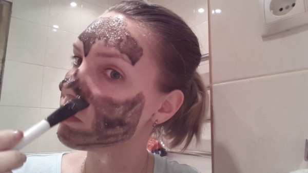 - Маску с активированным молотым углем и желатином тонким слоем нанести на участки с черными маленькими и большими точками.