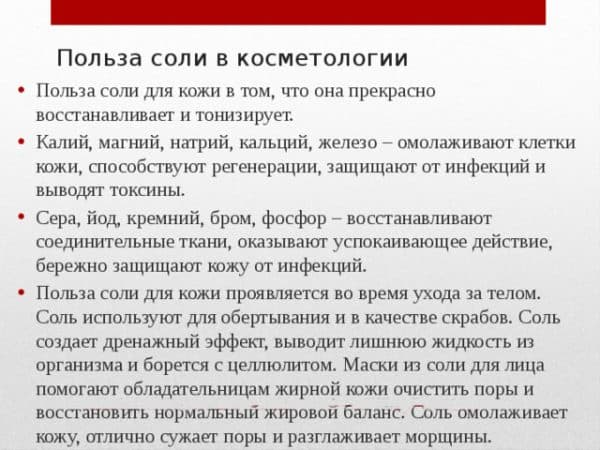 Очищает, выравнивает, смягчает. На чайную ложку соли (обычной или морской) берите столько же соды и немного воды. В результате смешивания компонентов должна получиться кашица. Смывайте спустя 10 минут водой.