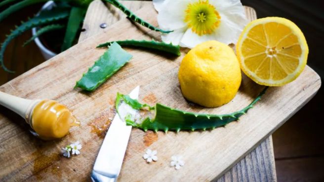 - Лимонная: смешать сок алоэ и сок лимона в равных пропорциях, наносить на лицо ватным тампоном.