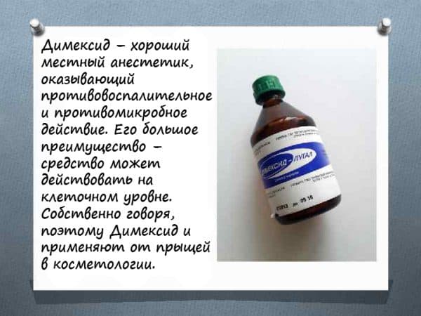 Димексид обладает противовоспалительным действием, поэтому активно устраняет гнойничковые высыпания, угри, прыщи и остающиеся после них пятна, улучшая цвет лица. Также характеризуется высокой растворяющей способностью, облегчая поступление внутрь тканей биологически активных компонентов других средств. Препарат защищает поверхность от проникновения внутрь токсинов и бактерий, очищая участки кожи и устраняя излишнюю жирность.