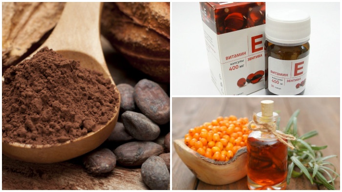 Слегка подогреть ложечку облепихового масло (поставьте чашку с маслом в миску с горячей водой на некоторое время), затем смешать масло порошком какао, чтобы получилась вязкая масса. Ввести в состав три капли витамина E.
