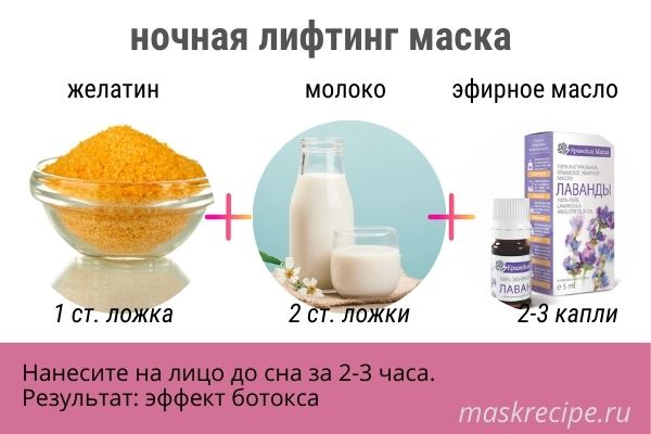 Данный метод имеет практически моментальный лифтинг-эффект. В составе желатина уже есть крахмал. Поэтому в него базу не добавляют. Для приготовления необходимо 1 ст. л желатина, по 30 мл грейпфрутового и лимонного сока. Порошок разбавляют в жидкости до полного растворения и мешают до тех пор, пока масса загустеет.