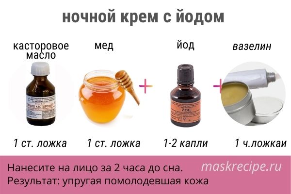 - Крем с йодом. Смешать 1 ложку (столовую) натурального жидкого мёда, 1 ложку (столовую) масла касторового (купить в аптеке), 1 ложку (чайную) вазелина, капнуть в смесь 2 капли обычной настойки йода. Смесь хорошо смешать, переложить в чистую и сухую стеклянную баночку, туго закрыть крышкой. Хранить этот крем нужно в холодильнике. Пользоваться этим самодельным кремом от морщин можно до 3 раз в неделю, нанося на 2 часа, затем смывая теплой водой. Этот крем хорошо помогает избавиться от морщин и пигментных пятен.