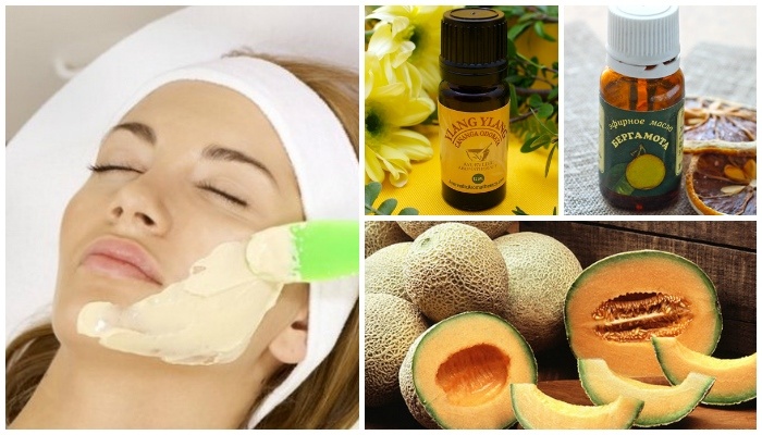 Для приготовления потребуется небольшой кусочек спелой дыни, его нужно измельчить до состояния пюре. Если будет слишком много сока, то нужно немного отжать. Добавить к столовой ложке дынного пюре 2 капельки эфира иланг-иланга 1 капельку эфира бергамота. Накладывать на четверть часа. Аналогичный состав можно приготовить, заменив дыню на авокадо.