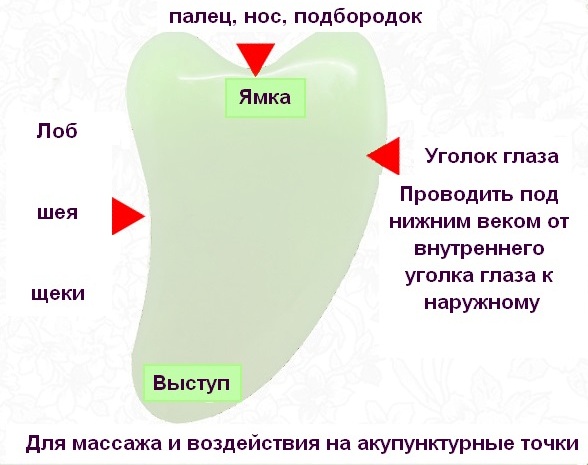 Массаж скребком гуаша необходимо выполнять исключительно по массажным линиям: от носа к вискам, от центра лба к вискам, от кончика носа ко лбу, от уголков рта к ушам, от центра подбородка к ушам. При проработке шеи все движения должны быть восходящими вверх. Перед началом массажа необходимо хорошо увлажнить кожу для лучшего скольжения камня: воспользуйтесь любым кремом для лица, который используете ежедневно.