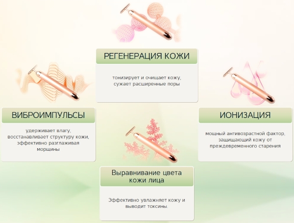 Данный массажер позволяет в домашних условиях выполнять популярную процедуру насыщения кожи разнополярными ионами. При воздействии микротоков кожа тонизируется, восстанавливает защитные функции и разглаживается. Прибор эффективно стимулирует генерацию коллагена, тем самым помогая избавиться от признаков старения. Массажер подходит для нежной кожи вокруг глаз. Деликатные микротоки борятся с тёмными кругами, мешками и «гусиными лапками». Также прибор понравится тем, кто хочет избавиться от носогубных морщин и подтянуть контур лица.