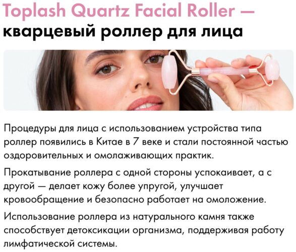 Роллер от бренда Toplash из натурального кварца – массажный ролик для лица, делающий морщинки менее выраженными и придающий коже здоровое сияние. Он дарит приятные тактильные ощущения. Регулярное проведение сеансов позволяет расслабиться, снять стресс и нормализовать кровообращение.