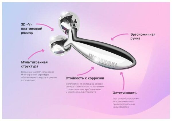 Массажер имеет уникальный дизайн и рабочую поверхность 360 градусов, что позволяет с комфортом использовать аппарат на любом участке лица и тела, учитывая индивидуальные анатомические особенности.