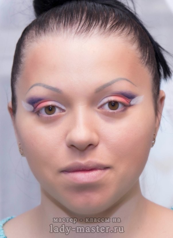 4. Запечатываем тенями акварель (белый перламутр, оранжевый, синий, далее делаем подводку (я использовала кремовую) и ей же подчеркнула форму рисунка и прорисовки над складкой + черными тенями затемняем внешний уголок глаза от рисунка к середине глаза и от линии складки между подвижным — неподвижным веком к брови.