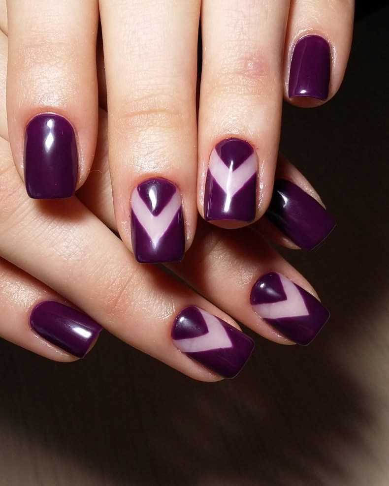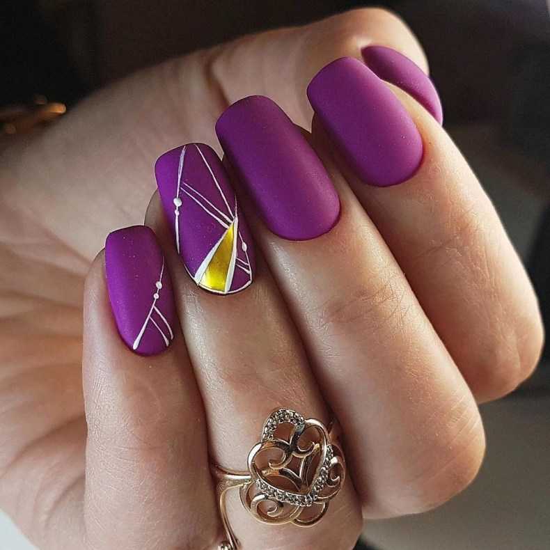 - Используйте фиолетовый или алый гель-лак и такой же декор. Наконец, на 1 ноготь расположите широкую полосу по центру, от основания до свободного края. А на соседней пластине нарисуйте два треугольника — тонкую и толстую линии.