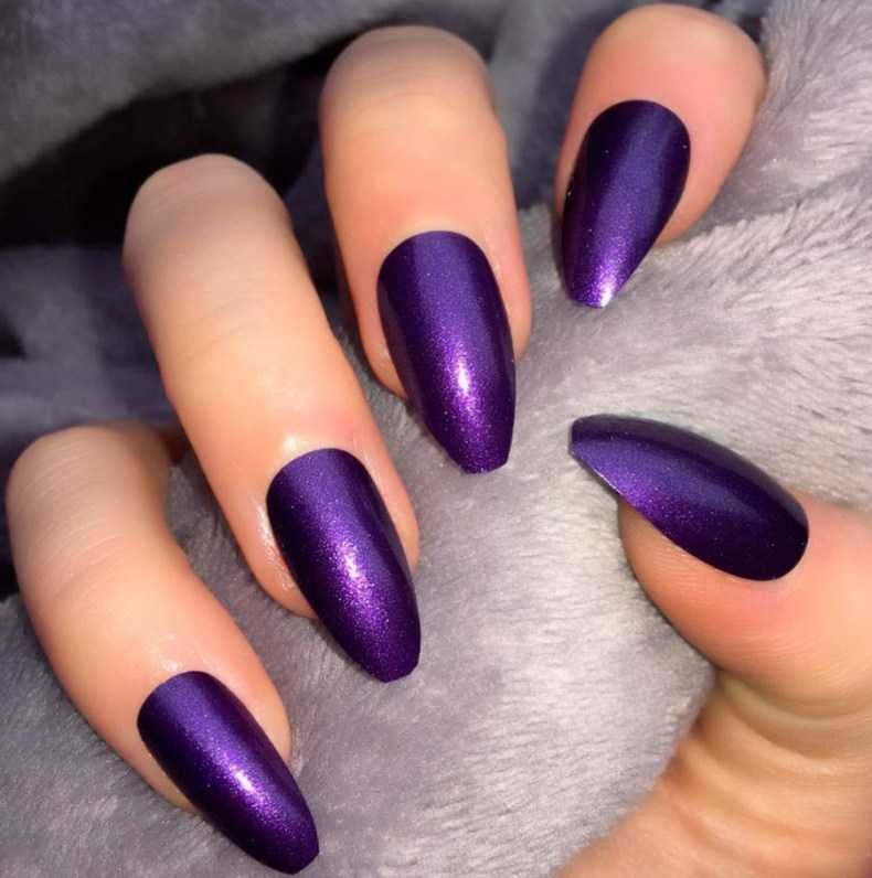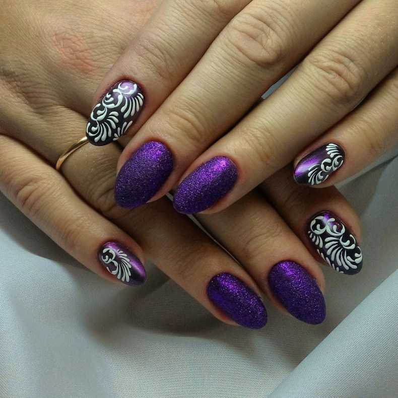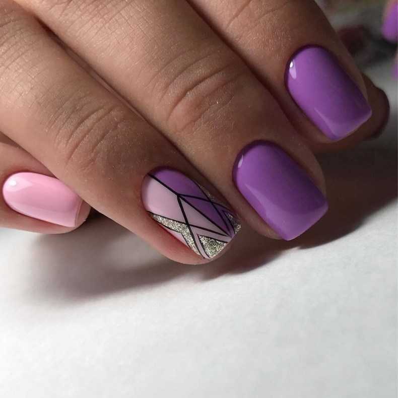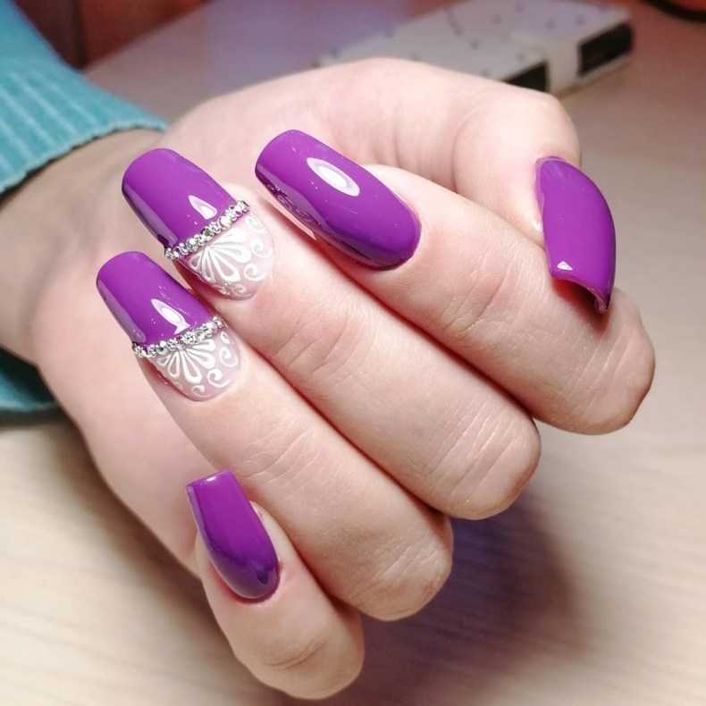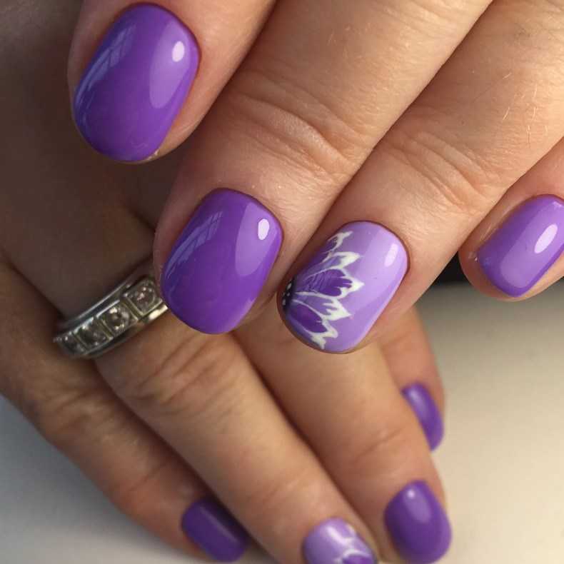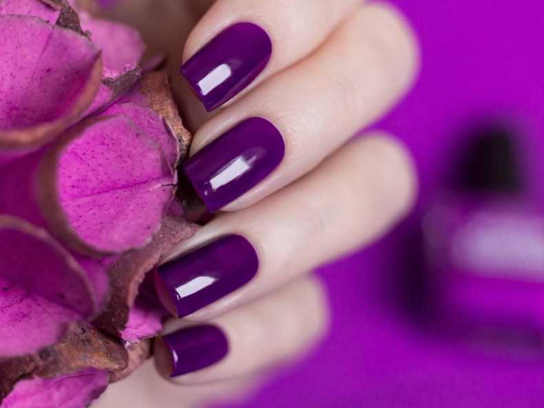 Разнообразие цветов фиолетового маникюра и их сочетаний порой удивляет. Здесь уместны любые оттенки от ярко-лилового до нежно сиреневого, или полночно темно-фиолетового.