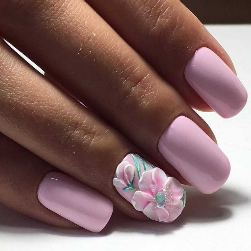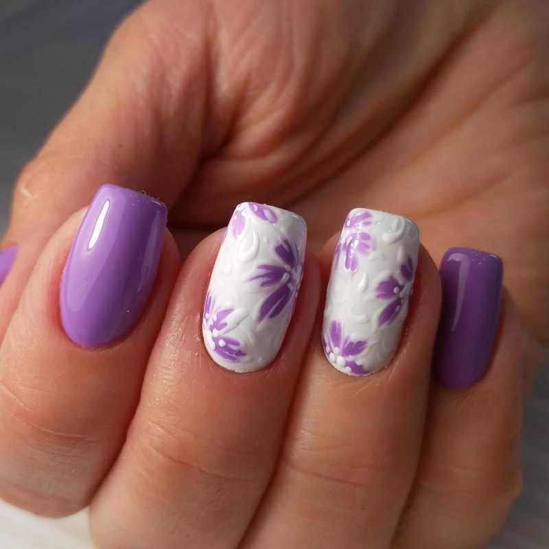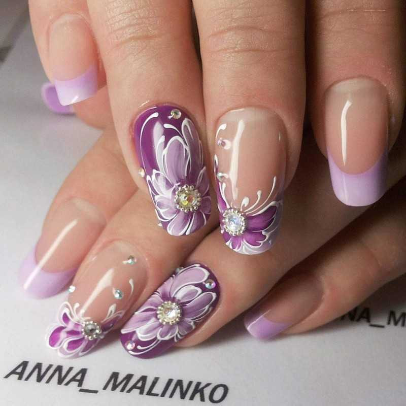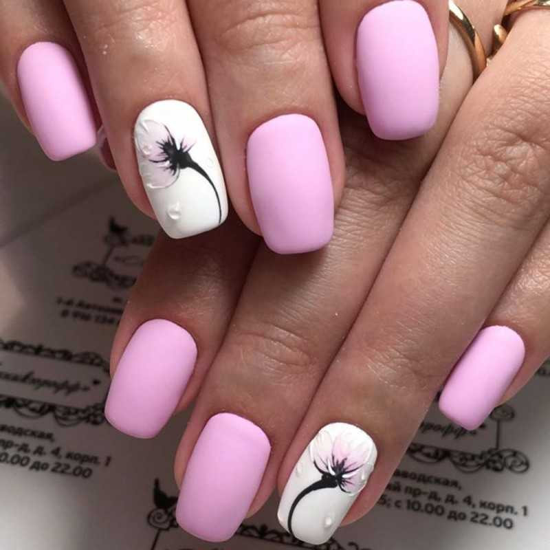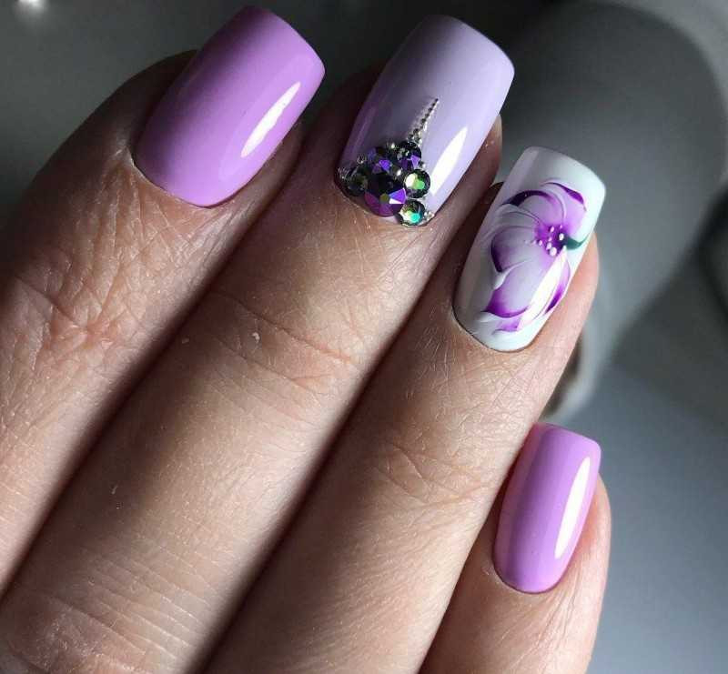 Работать с акварелью умеют не все мастера, поэтому если вы решили выполнить такой дизайн, заранее поинтересуйтесь у мастера о его опыте. Акварельный маникюр выполняется в светлых тонах, главным из которых является белый. На белом фоне цветы смотрятся очень мягко и сдержанно. Для изображения цветов используется фиолетовый и розовый цвета с многочисленными полутонами.