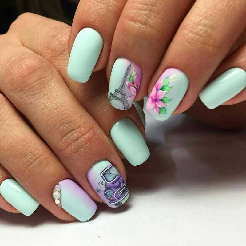 Маникюр акварельными красками смотрится невероятно нежно и воздушно. Благодаря использованию специальной акварели рисунок получается легким и полупрозрачным с эффектом градиента. На фото ниже вы можете видеть пример такого стильного и нежного нейл-арта.