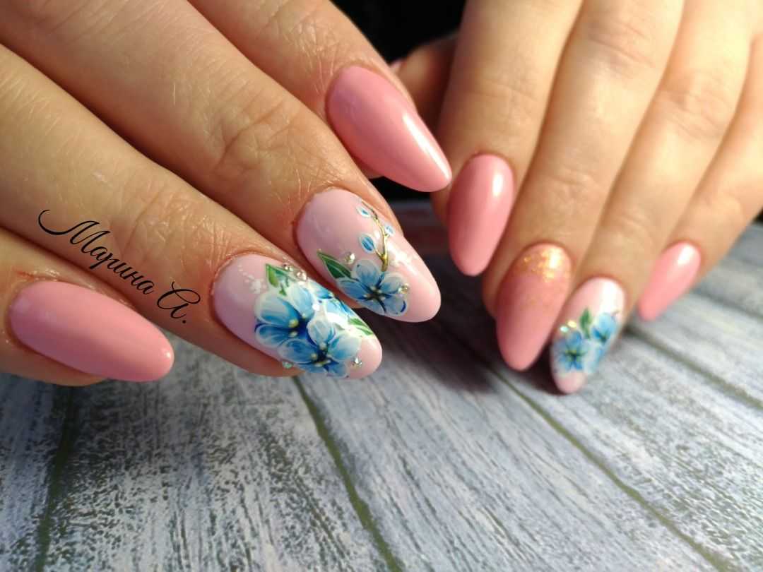 Маникюр акварельными красками смотрится невероятно нежно и воздушно. Благодаря использованию специальной акварели рисунок получается легким и полупрозрачным с эффектом градиента. На фото ниже вы можете видеть пример такого стильного и нежного нейл-арта.