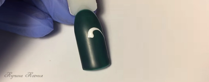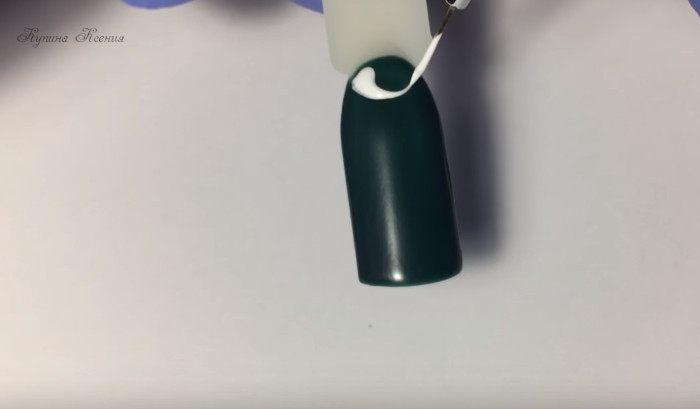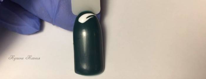 - С помощью белого лака от свободного края ногтевой платины к ее центру провести постепенно сужающиеся линии.