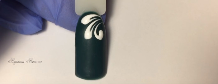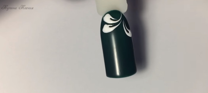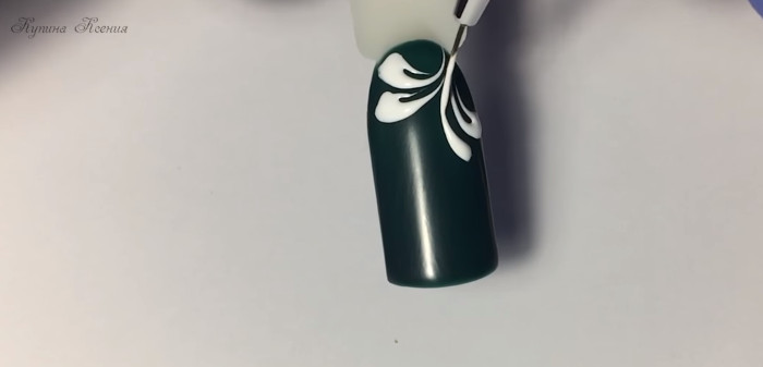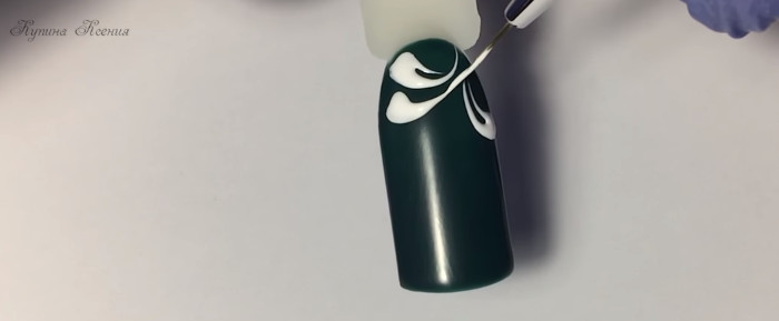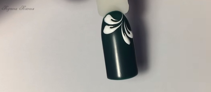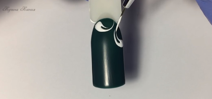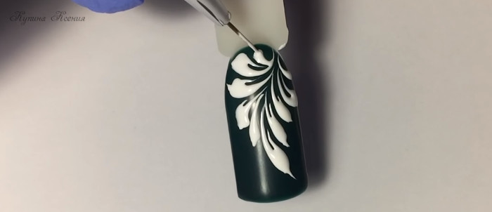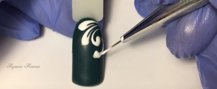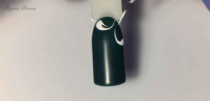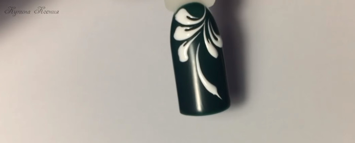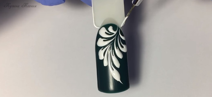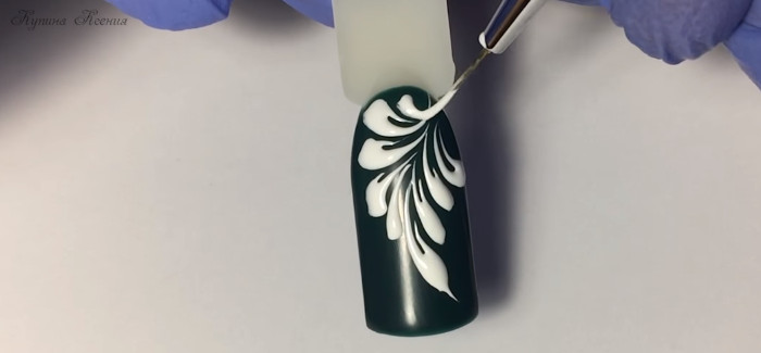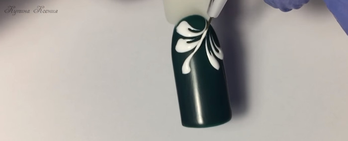 Затем нижняя капля иглой соединяется с расположенной рядом белой с трех сторон — по бокам и прямой линией. Хвост верхней точки следует закрутить в небольшую спираль. Для усиления эффекта вблизи основания можно дорисовать листья колоска зеленым лаком.
