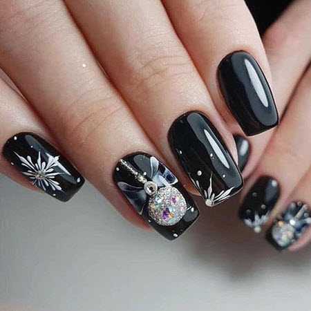 Изысканный черный маникюр с красивым дизайном подойдет для вашего лучшего новогоднего маникюра 2021. Черный лак отлично сочетается с блестками и камнями, которые будут отличной идеей для маникюра на Новый год.