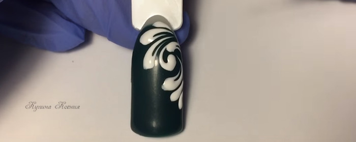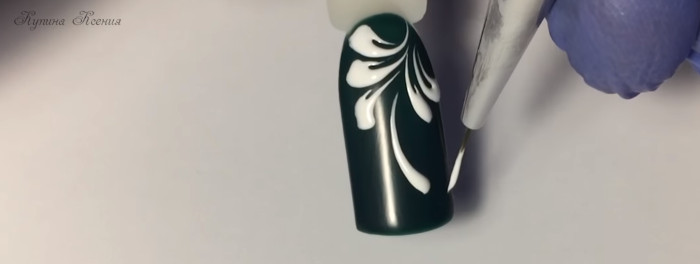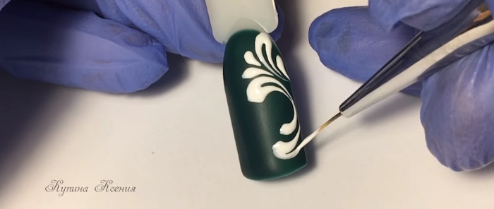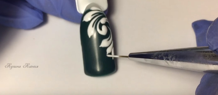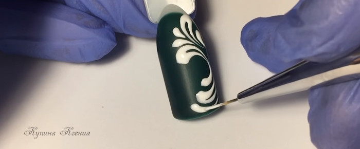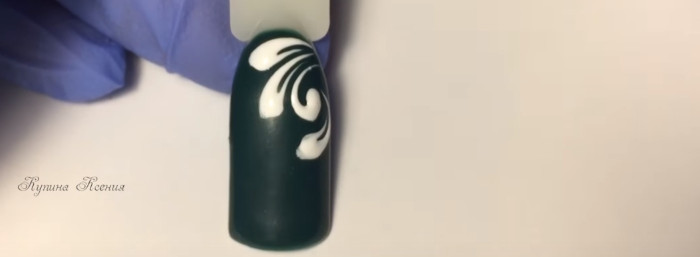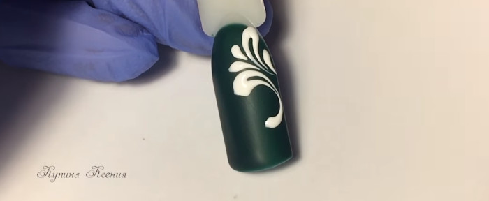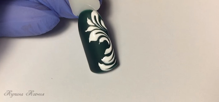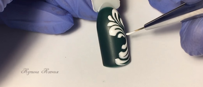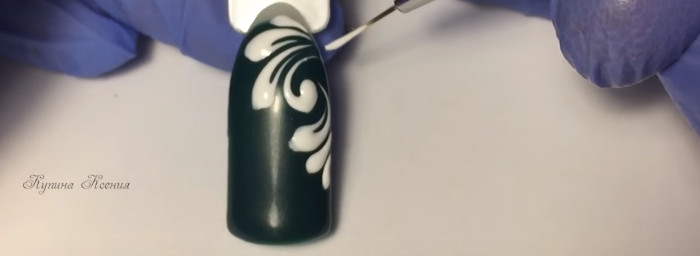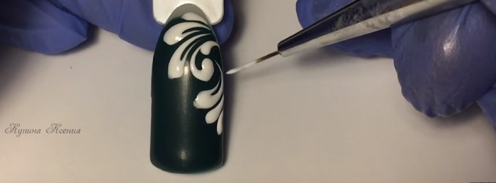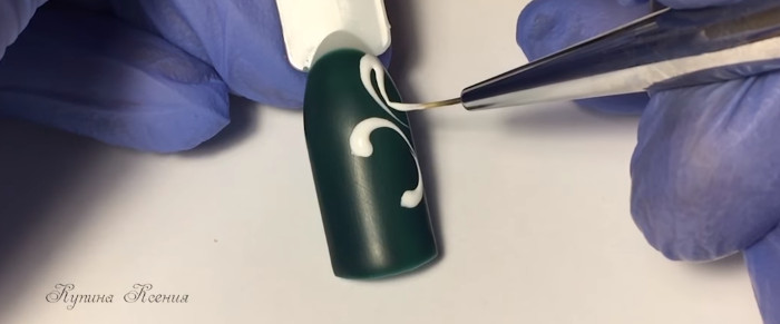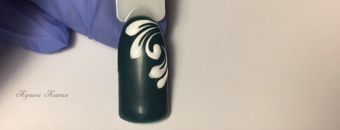 Теперь поэтапно рисуем вензеля на ногтях. На однотонных подготовленных ногтях нарисуйте вензеля, как показано на фото. В этом маникюре должно быть большое количество линий и чередование их толщины. Для того чтобы избежать перегруженности, оставьте некоторые из ногтей без декора. На среднем ногте сделайте лепку из геля-пластилина. Перенеся небольшое количество на поверхность ногтя и при помощи кисти, придав нужную форму. В завершении высушите декор под лампой.